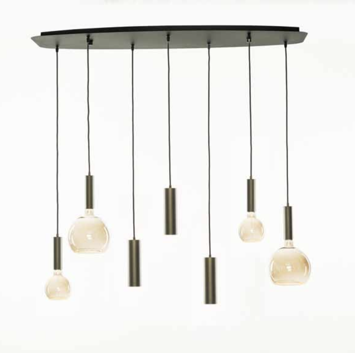 Hanglamp Deens ovaal. Plaat is 120x40cm. Plaat is zwart, fittingen bruin/brons. Inclusief: 3x Spot GU10 2x Globe 20cm 2x Globe 15cm.