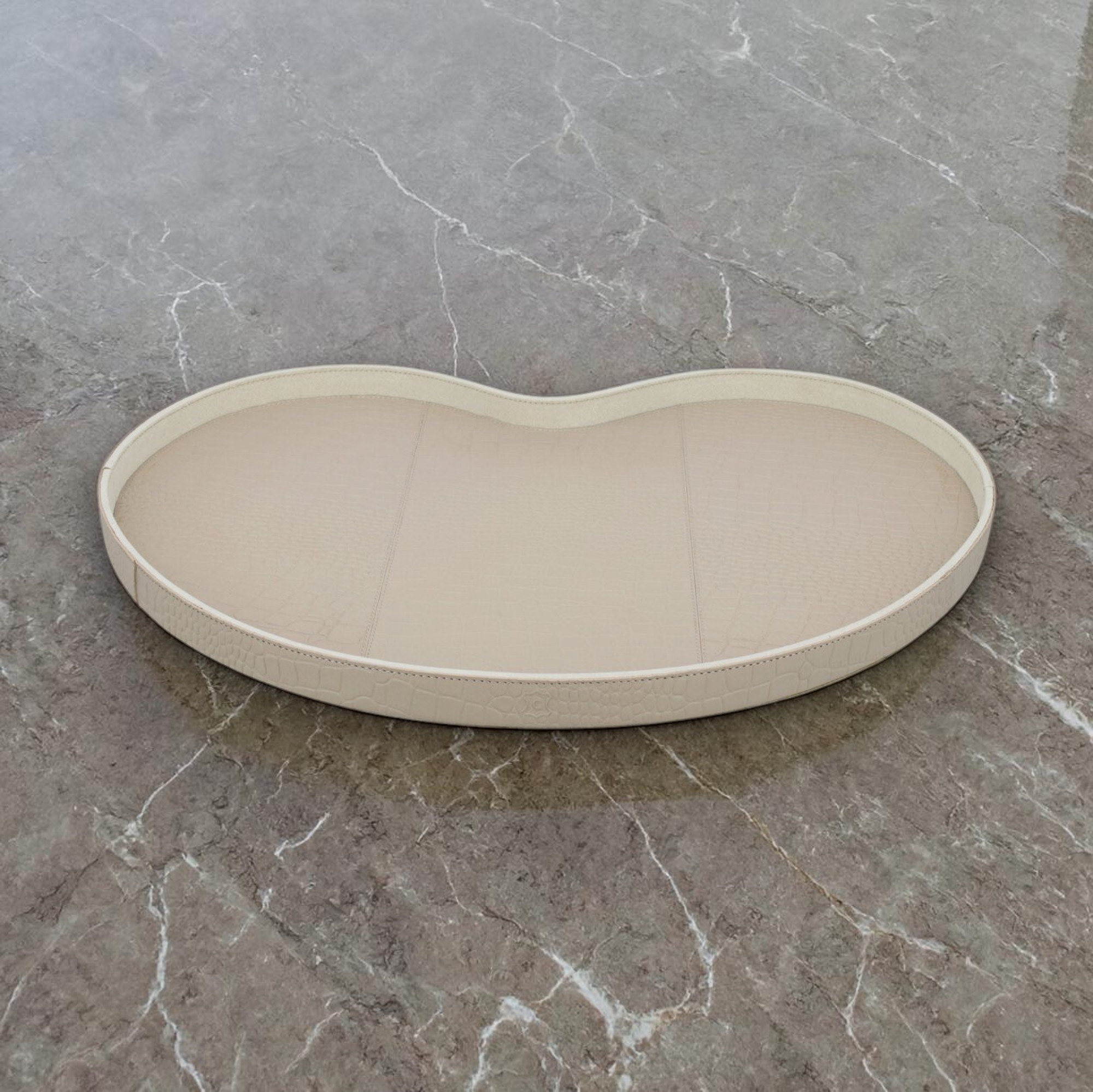 Dit stijlvolle kidney-vormige dienblad is een echte eyecatcher in elk interieur. Het dienblad is mooi afgewerkt en uitgevoerd in een elegante beige tint met een subtiele croco print, wat zorgt voor een luxe en moderne uitstraling. Perfect als