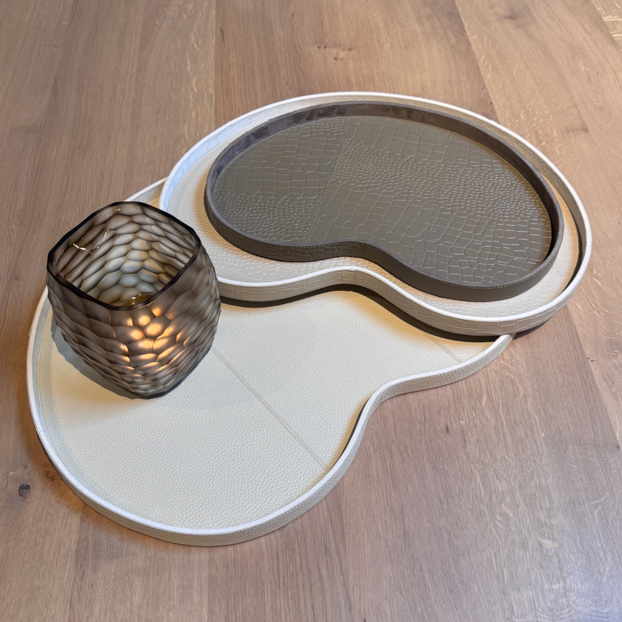 Dit stijlvolle kidney-vormige dienblad is een echte eyecatcher in elk interieur. Het dienblad is mooi afgewerkt en uitgevoerd in een elegante beige tint in effen leer, wat zorgt voor een luxe en moderne uitstraling. Perfect als decoratief item