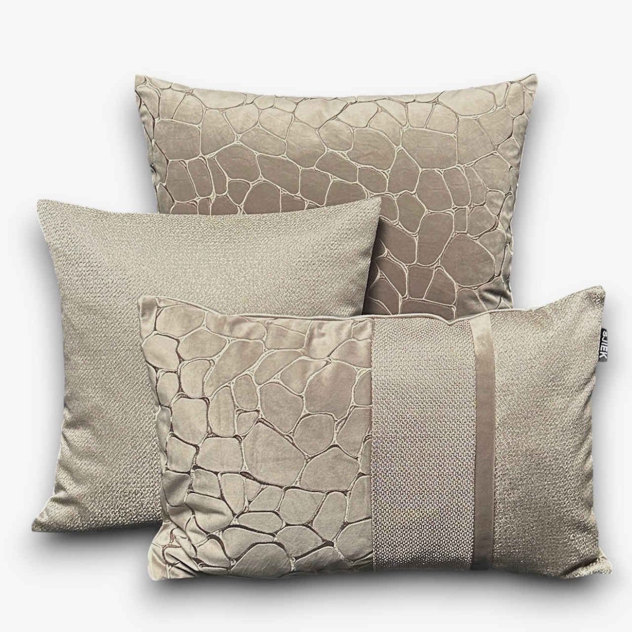 Dit is een prachtige set kussens van geweven en velours stof met verschillende motieven en prachtige glans.