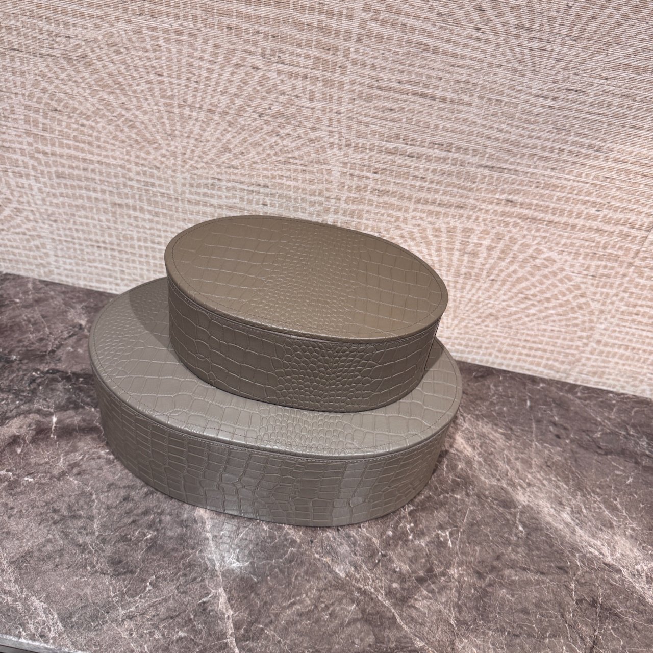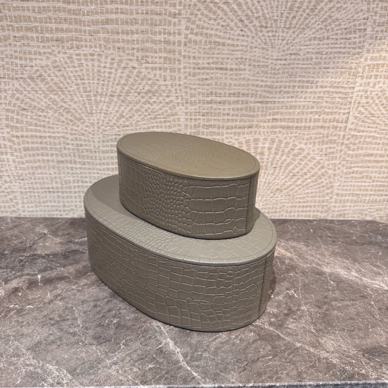 Mooi leren opbergboxen Taupe Croco, leuk voor op tafel, maar ook in een kast staan deze items prachtig. Praktische en hip in jouw woning. Afmeting S: 23 cm x 9 cm Afmeting M: 34 cm x 11 cm