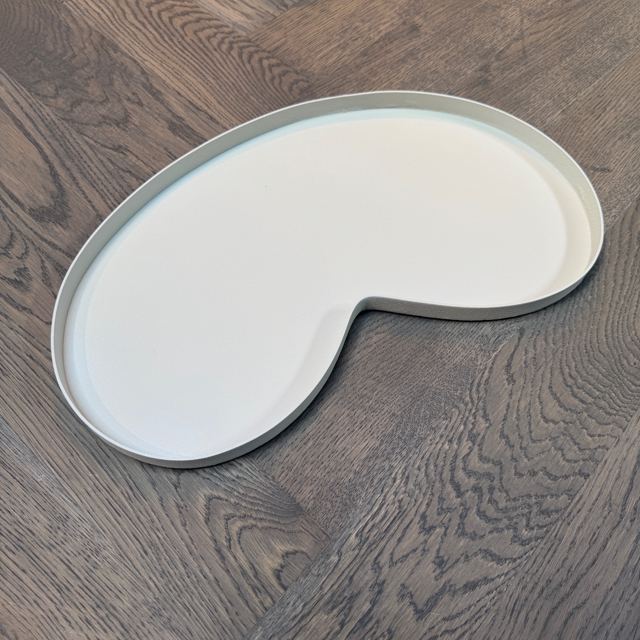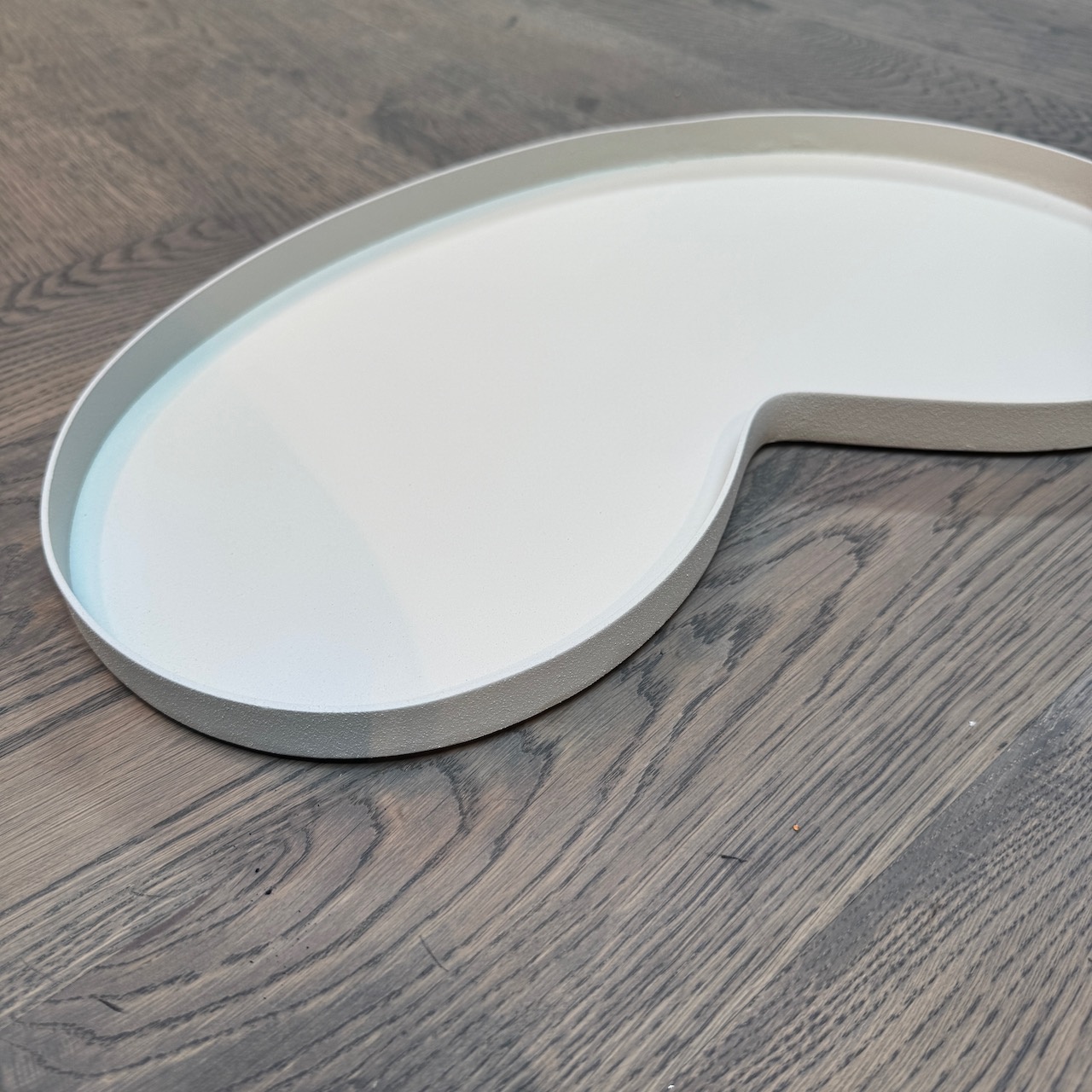 Leuke vorm organisch dienblad wat van metaal gemaakt is. Ivory. Staat decoratief. Mooie kleur warm Ivory. Maat M: L45 x B26 x H2 cm Er is ook een grotere maat te bestellen.