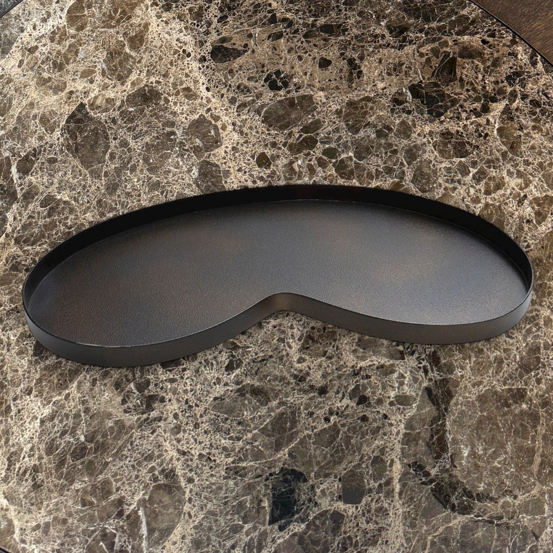 Leuke vorm organisch dienblad wat van metaal gemaakt is.