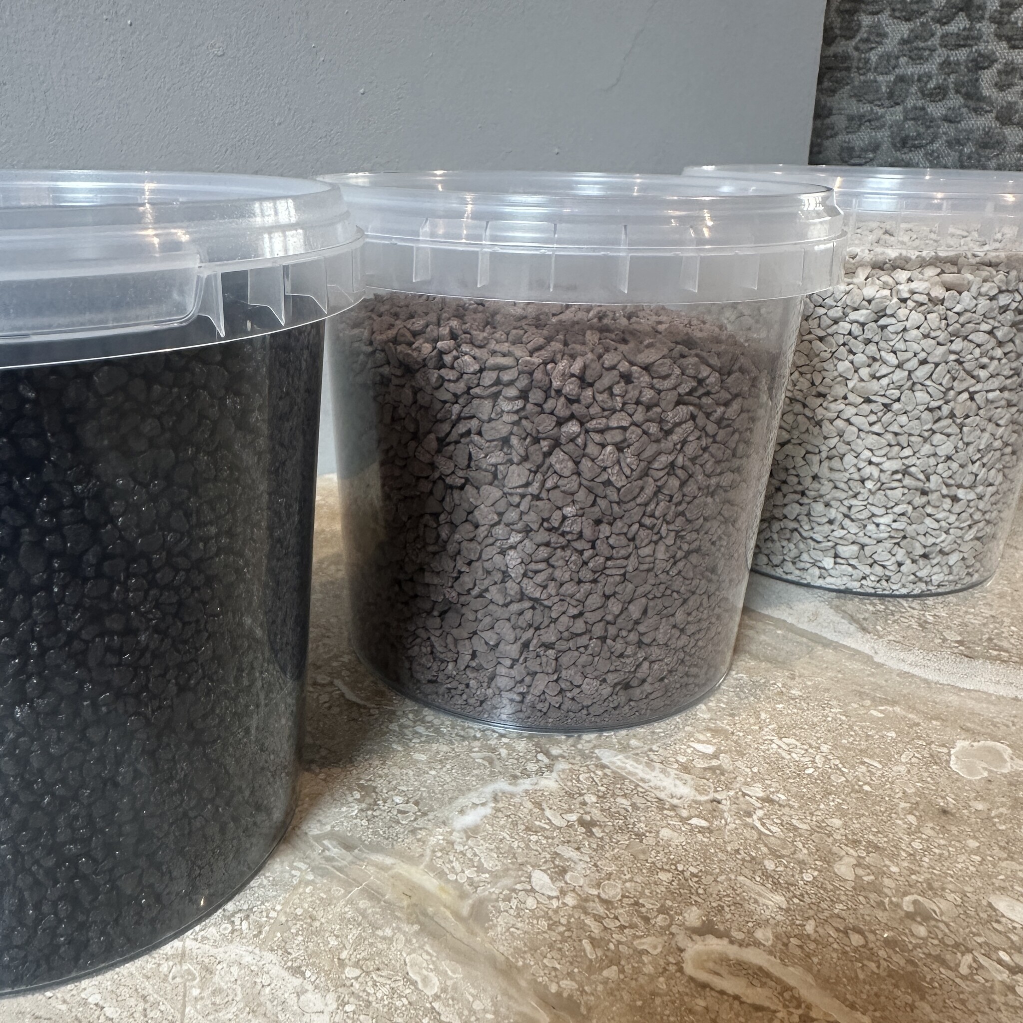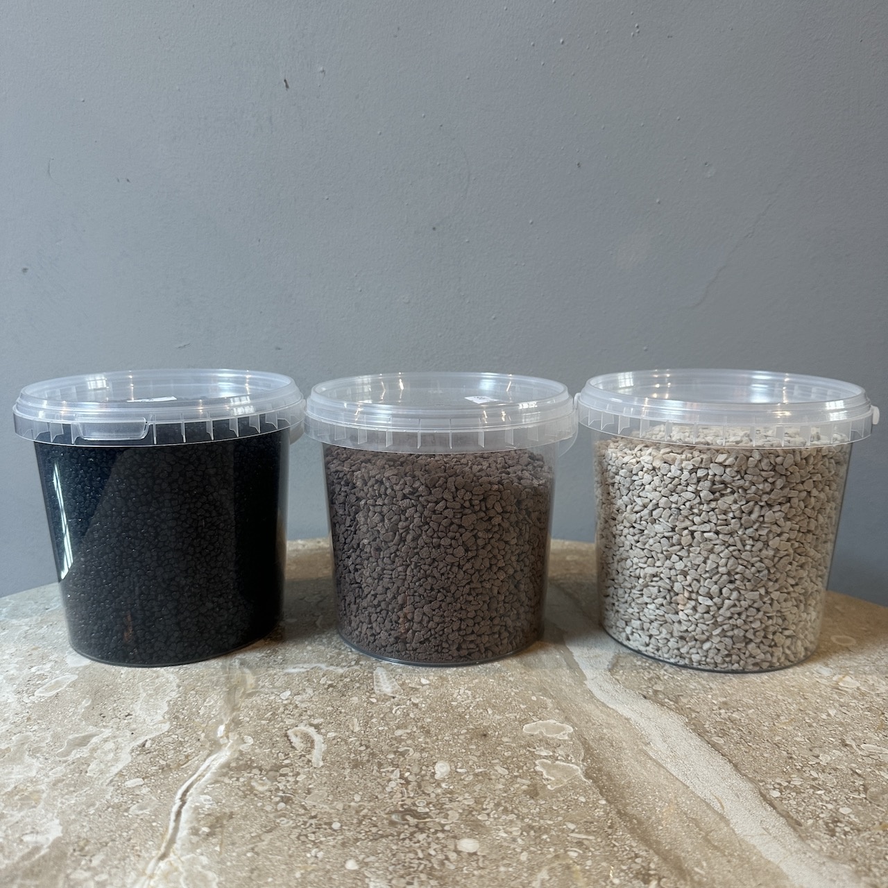 U kunt decoratie steentjes bestellen. 1l voor dit windlicht is voldoende.
